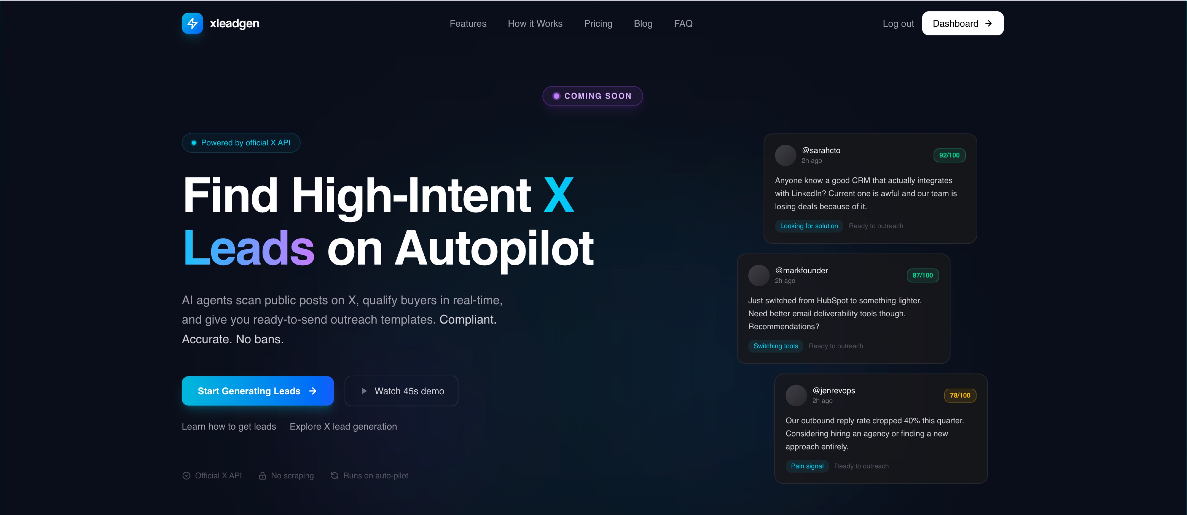 AI agents scan public posts on X, qualify buyers in real-time, and give you ready-to-send outreach templates. Compliant. Accurate. No bans.